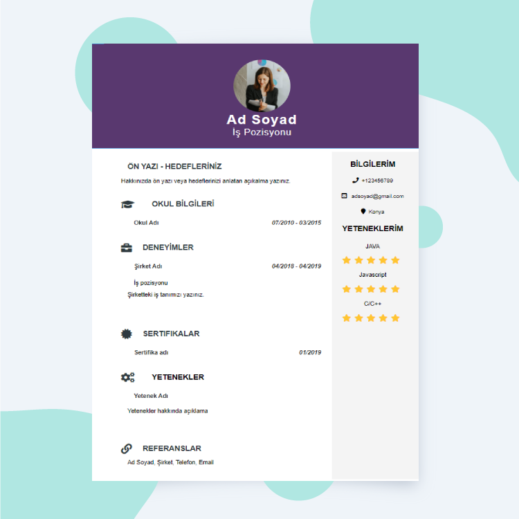 Özgeçmiş Örnekleri kategorisi; tüm meslek gruplarını kapsamaktadır. Mesleğe uygun içerikler ile doldurabilirsiniz.